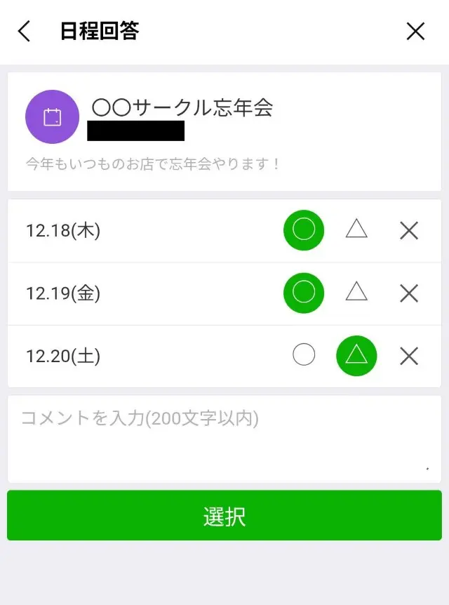 なお、今回の場合は候補日として3日分を設定しています。この3日分の〇、△、×を全て選択すると、緑の「選択」ボタンを押すことができるようになります。