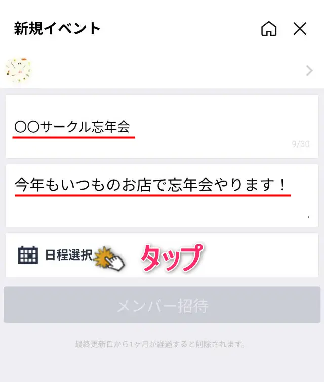 一方、「LINEスケジュール」はグループを事前に作成する必要はありません。先にイベントと候補日を作成して、そこにメンバーを招待します。