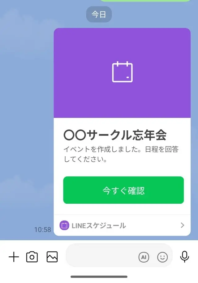 上記の手順で、トークルーム内で日程調整表が配信されます。トークルームのメンバーは「今すぐ確認」ボタンを押すと、イベントの実施候補日を確認できます。