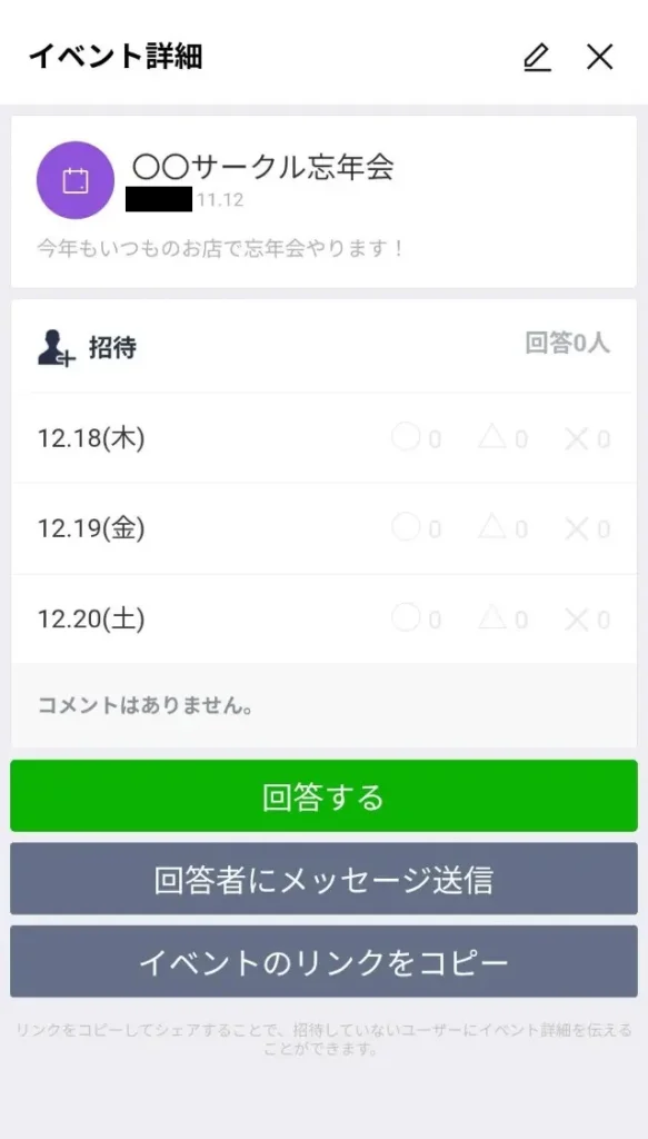 → 日程調整は“日付単位”なので、時間を決めたい場合は「投票機能」を併用すると◎。 - グループ外の人が回答できない