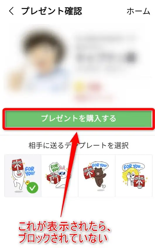 ここでプレゼントできないという表示になれば、ブロックされている可能性が高いです。一方、下図のように「プレゼントを購入する」という表示が出ればブロックされていません。
