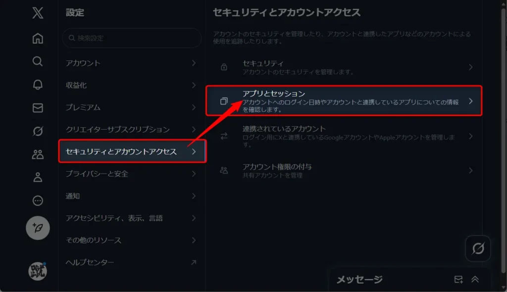 「セキュリティとアカウントアクセス」>「アプリとセッション」を選択